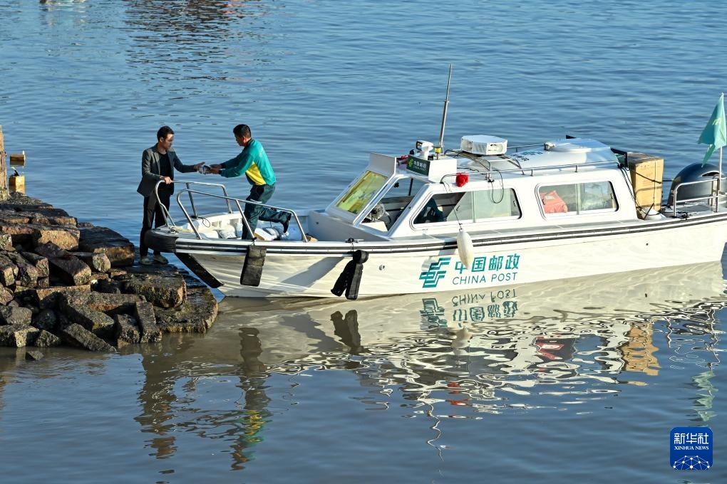 12月2日,在宁德市蕉城区三都镇虾荡尾村码头,石进全为渔民送快递。