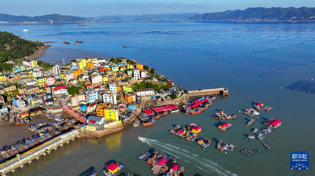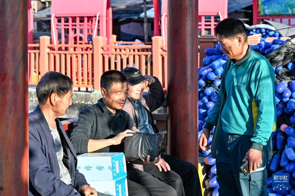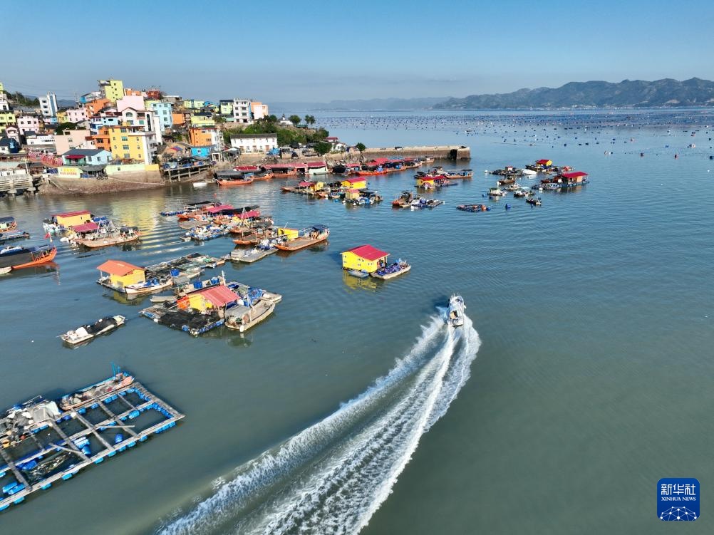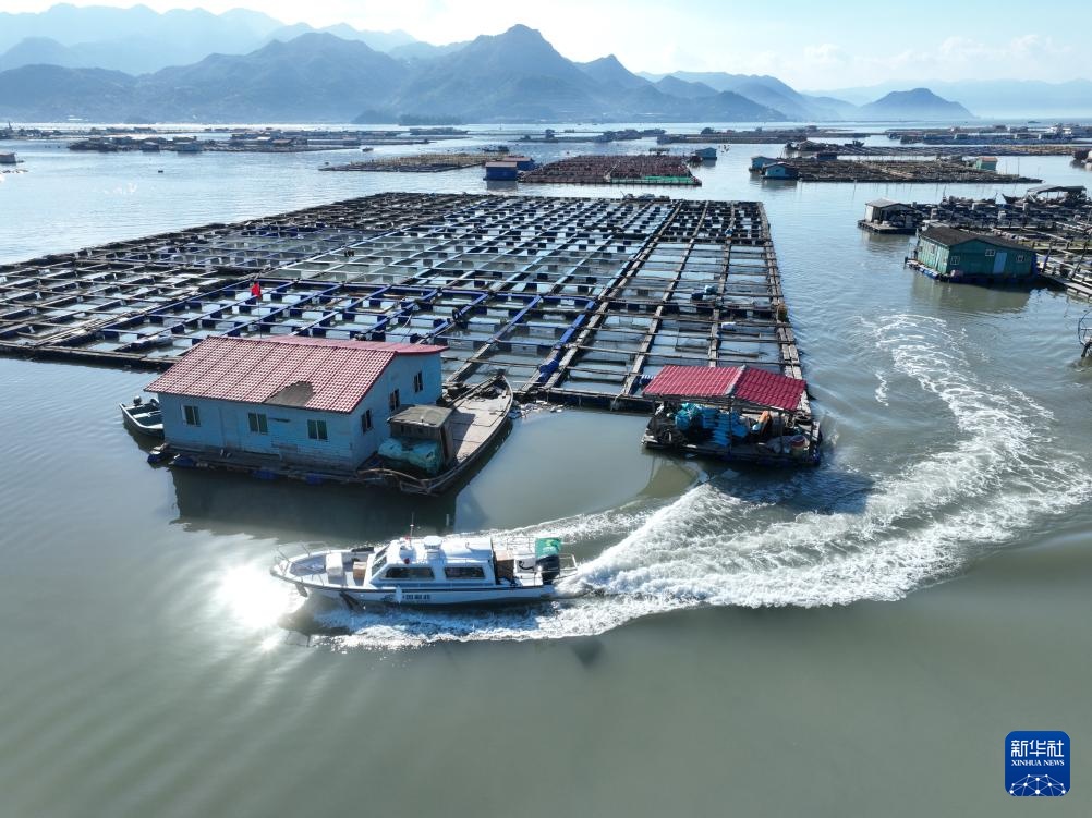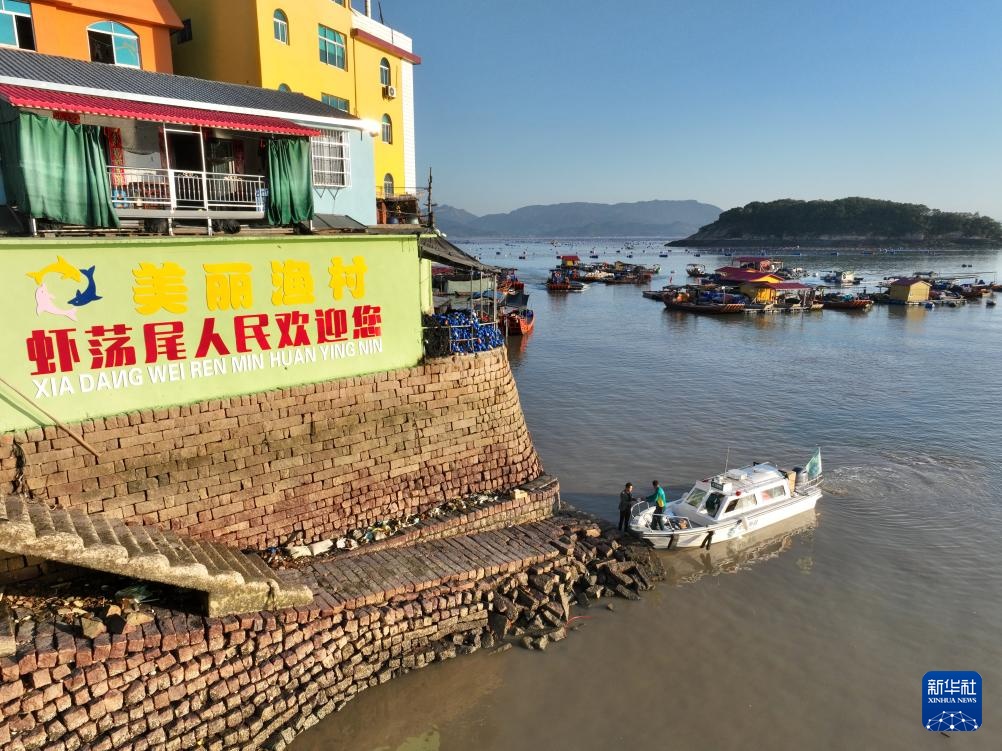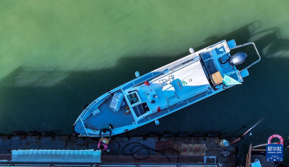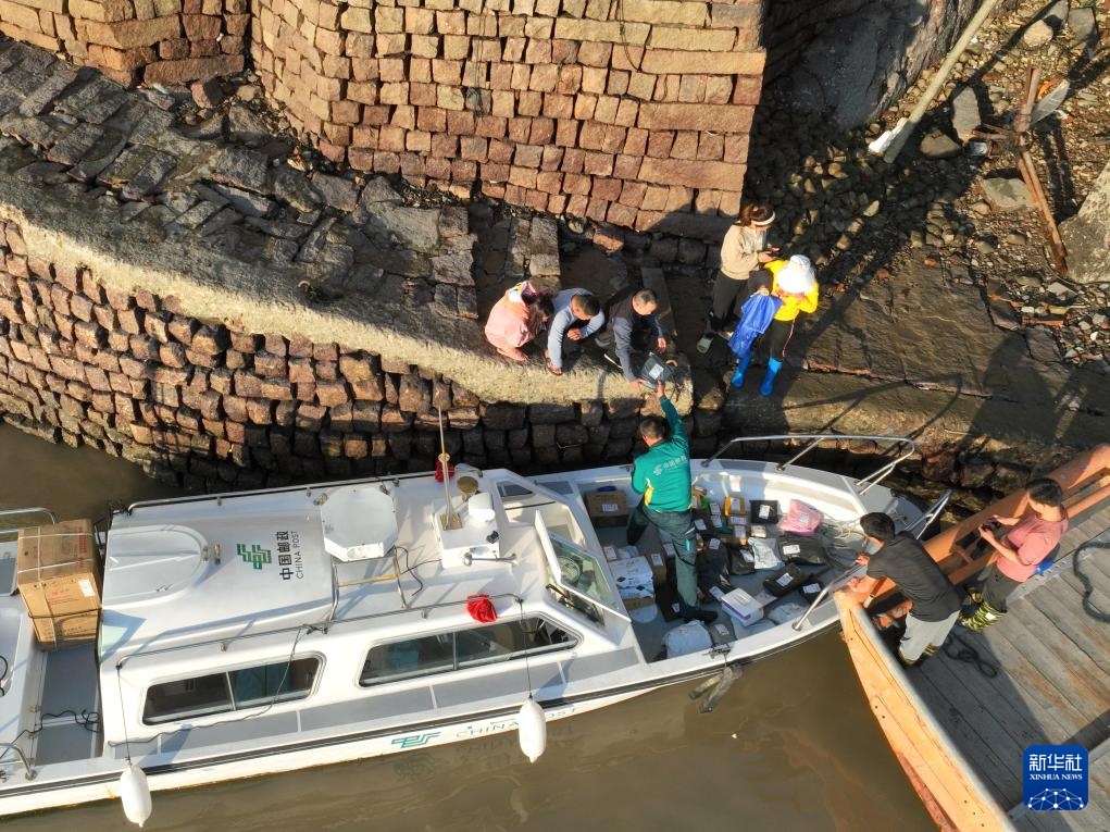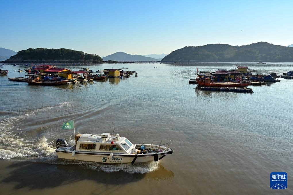 12月2日,在宁德市蕉城区三都镇虾荡尾村码头,石进全为渔民分发快递(无人机照片)。