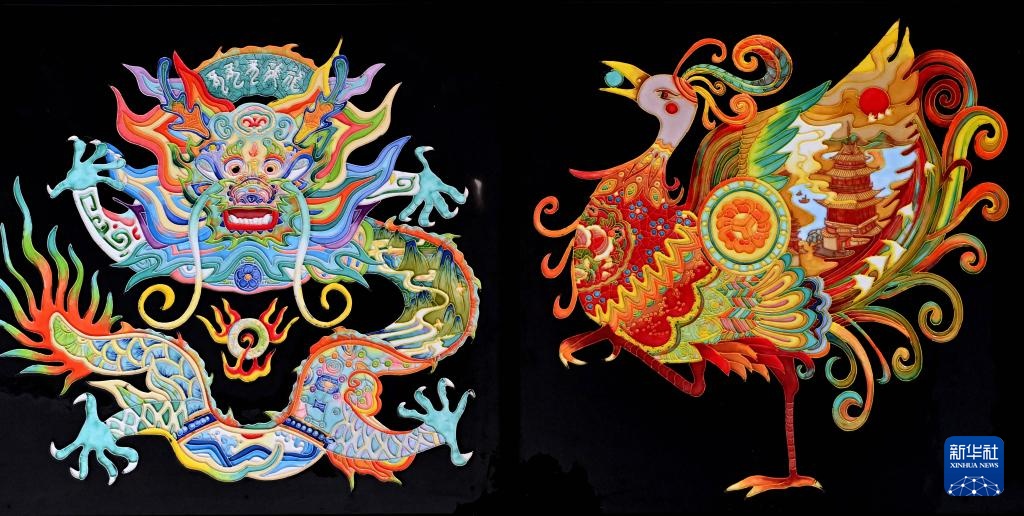 这是成果创作的三彩壁画作品《瑞兽录——青龙》和《瑞兽录——朱雀》(12月3日摄)。
