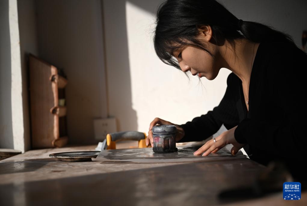 12月3日,在洛阳花城美陶工作室,成果将扎好的画稿拓印至素坯上。