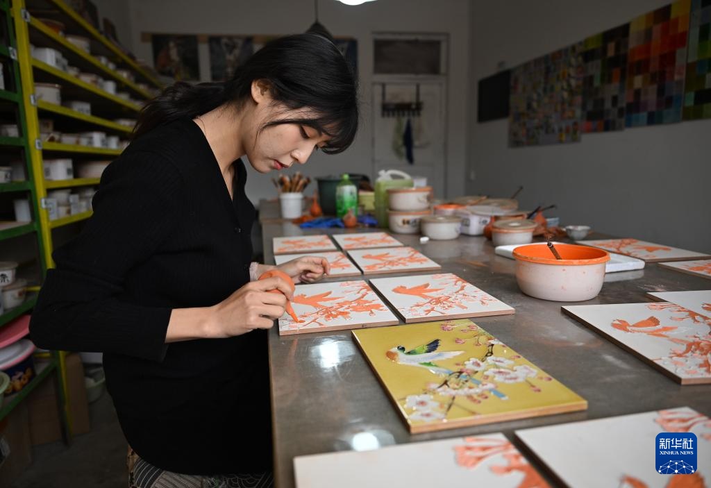 在洛阳花城美陶工作室,今年27岁的成果是河南省洛阳市非物质文化遗产三彩壁画制作技艺的第五代传承人。她自幼跟随父亲学习绘画,16岁时开始和父亲一起参与三彩壁画的制作。通过不断实践与积累,成果目前已能够熟练掌握画稿、扎稿、立线、施釉、烧制等三彩壁画制作技艺的关键步骤。
