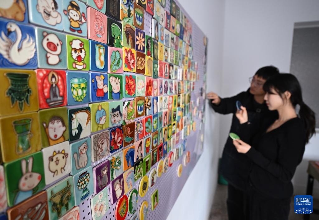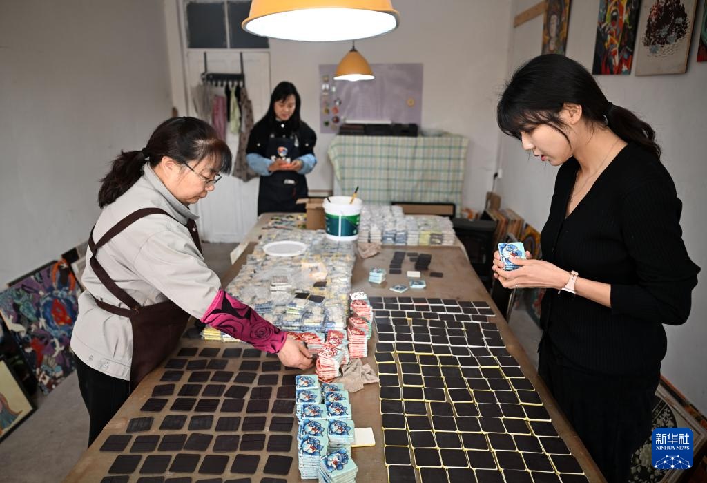 12月3日,在洛阳花城美陶工作室,成果(右)在组装三彩壁画文创产品。