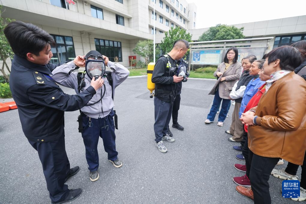 12月4日,道场乡应急消防管理站工作人员指导有限空间作业人员正确佩戴正压式空气呼吸器。