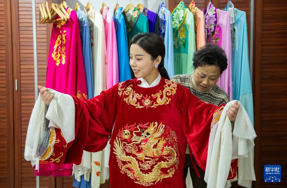 11月29日,在怀宁县黄梅阁剧院,谢慧慧(左)在服装室穿戏服。