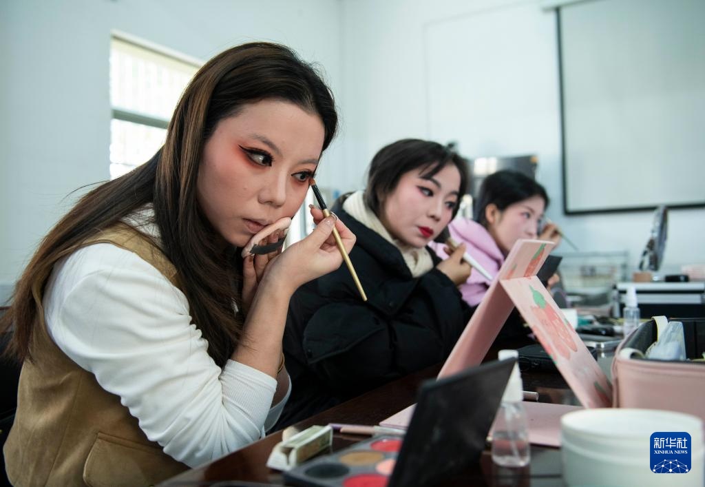 11月28日,在怀宁县三祝初级中学,谢慧慧(左)在“黄梅戏进校园”演出前化妆。