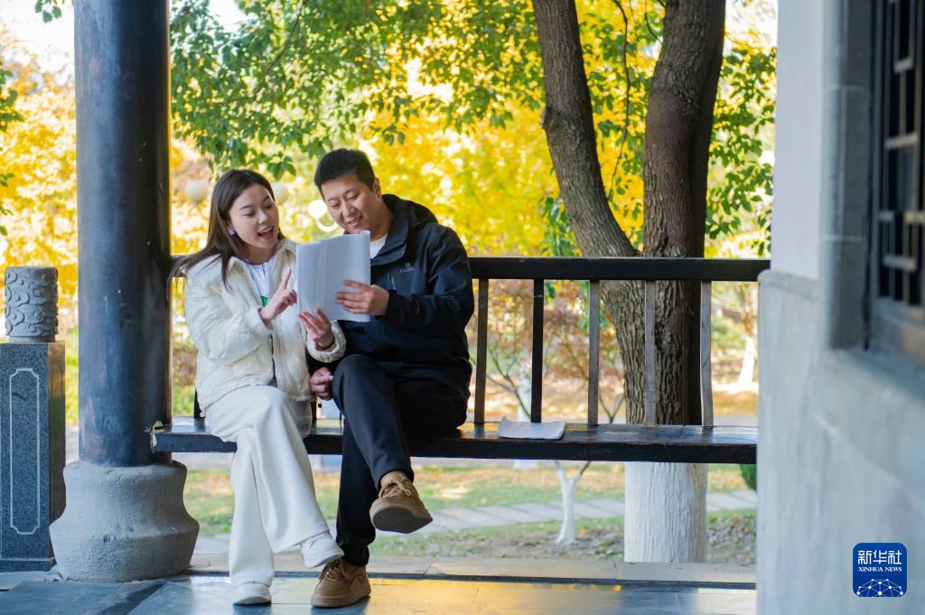 11月29日,在怀宁县黄梅阁剧院外,谢慧慧(左)和同为剧团演员的丈夫左小伟一起讨论剧本。