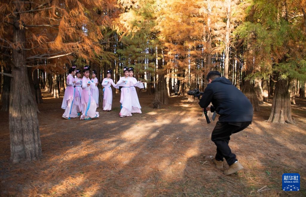 11月28日,在怀宁县雷埠乡,谢慧慧(演员前排左一)和同事参与剧团短视频录制。