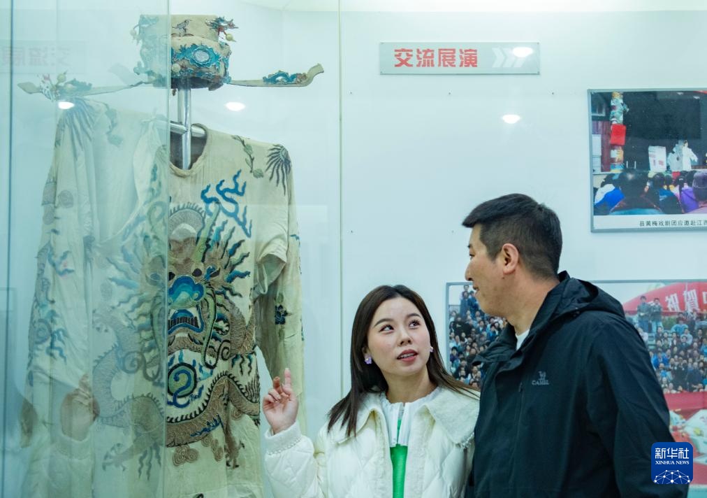 11月29日,在怀宁县黄梅阁剧院,谢慧慧(左)和同为剧团演员的丈夫左小伟在史料陈列室讨论戏服展品。