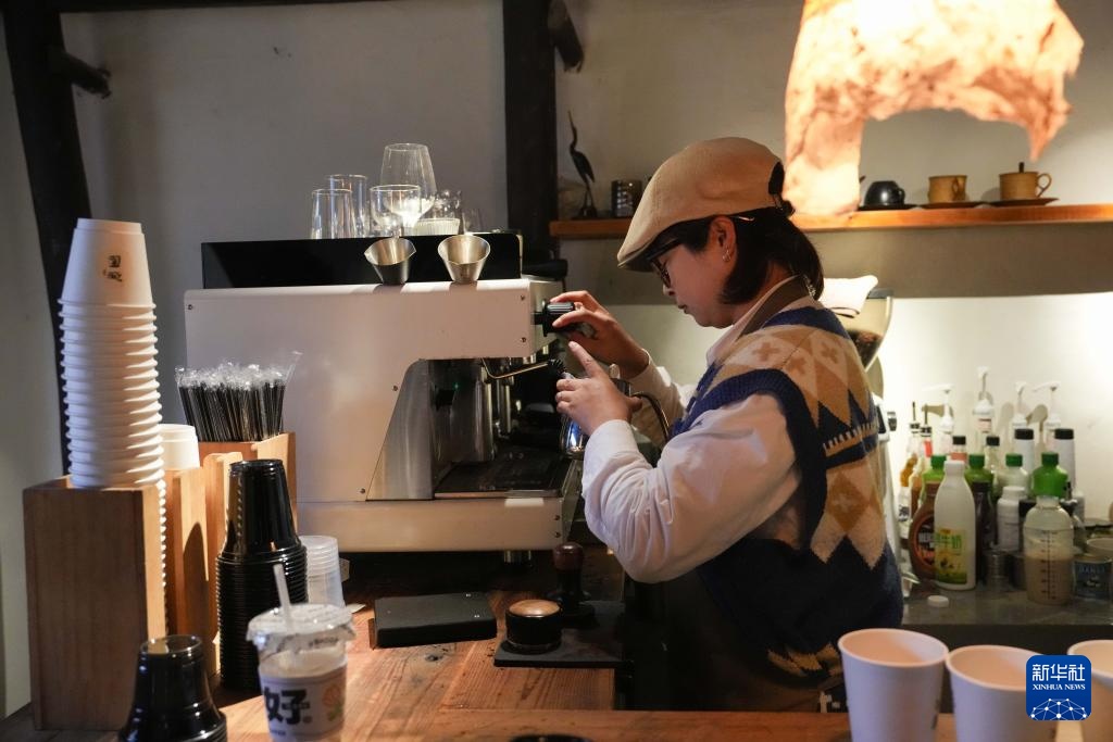 12月5日,咖啡店员在浙江宁波南阳自然村南阳福园制作咖啡。