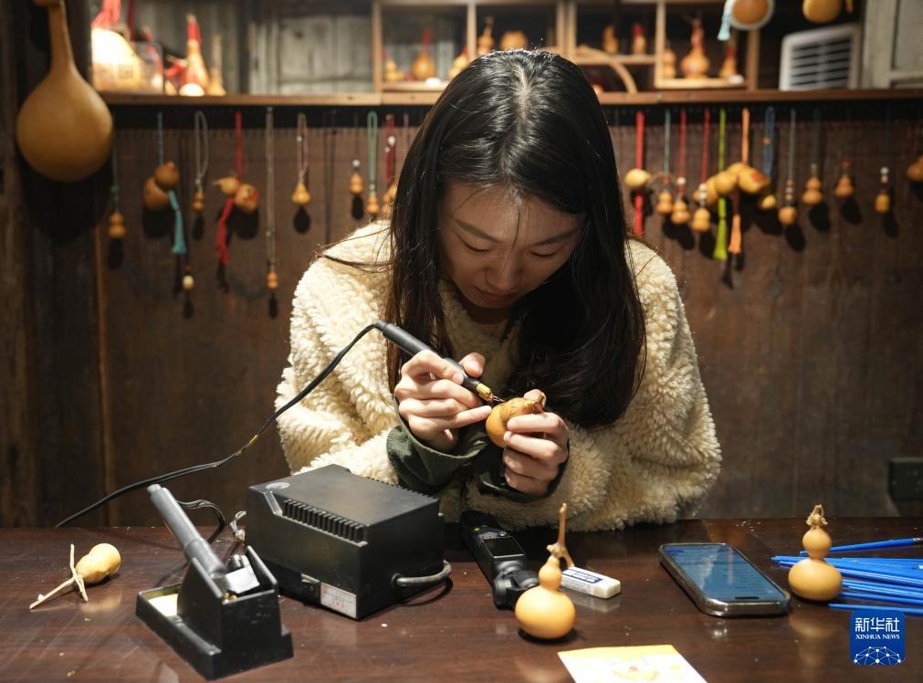12月5日,游客在浙江宁波南阳自然村南阳福园体验葫芦烙画。