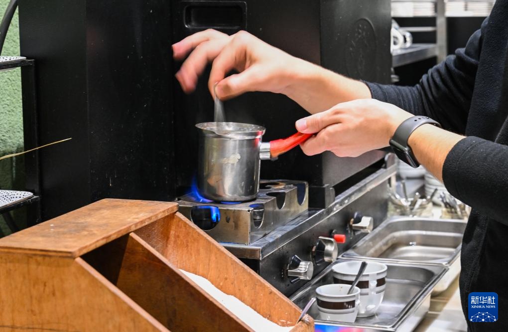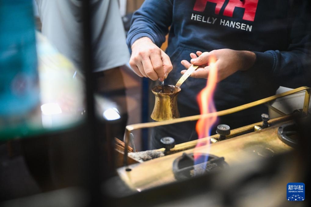 12月5日,在土耳其伊斯坦布尔一家咖啡馆内,一名工作人员制作土耳其咖啡。