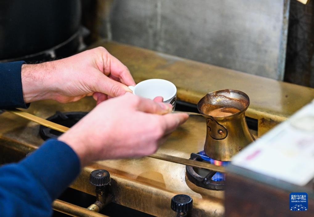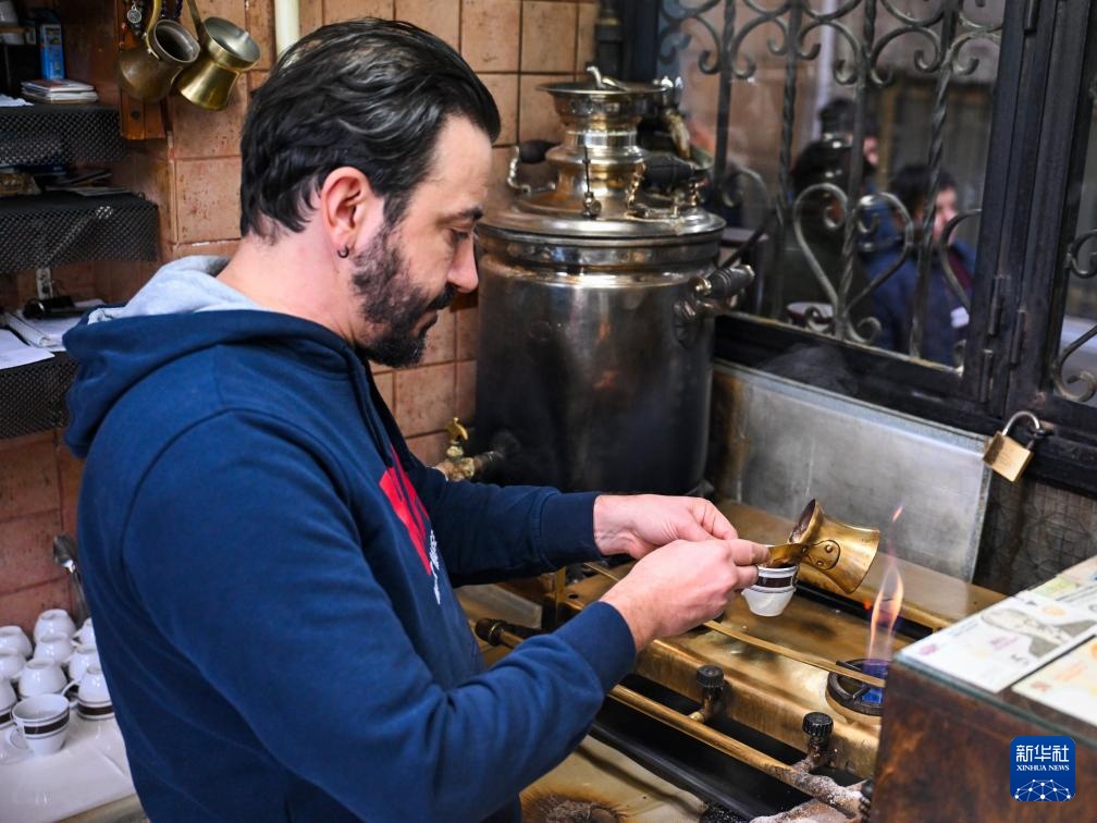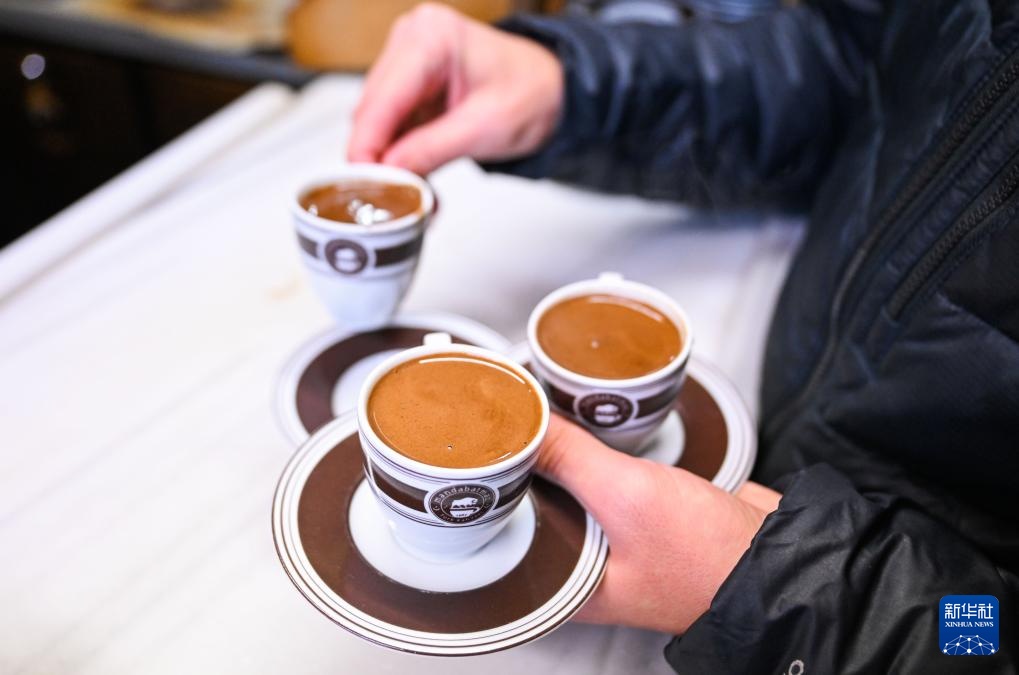 12月5日,在土耳其伊斯坦布尔一家咖啡馆内,一名工作人员准备将制作好的土耳其咖啡端给顾客。