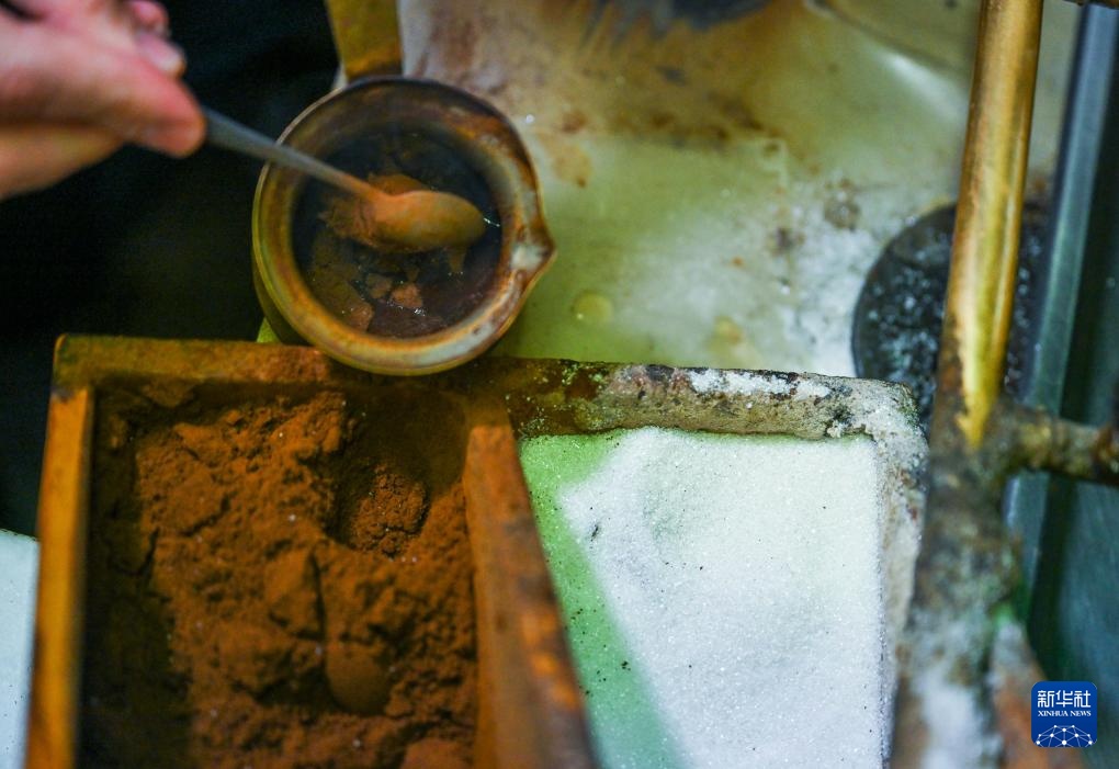 12月5日,在土耳其伊斯坦布尔一家咖啡馆内,一名工作人员往器皿中添加咖啡细粉。