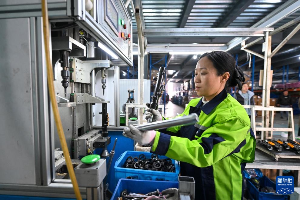 12月6日,在天津市武清区王庆坨镇摩单避震前叉公司,工人在车间内装配电动车避震前叉产品。