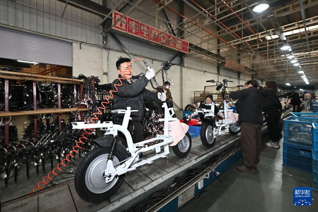 12月6日,在位于天津市武清区王庆坨镇的天津踏浪科技股份有限公司生产车间内,工人在流水线上装配电动自行车。