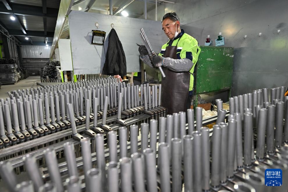 12月6日,在天津市武清区王庆坨镇摩单避震前叉公司,工人在车间内对避震筒进行质检。