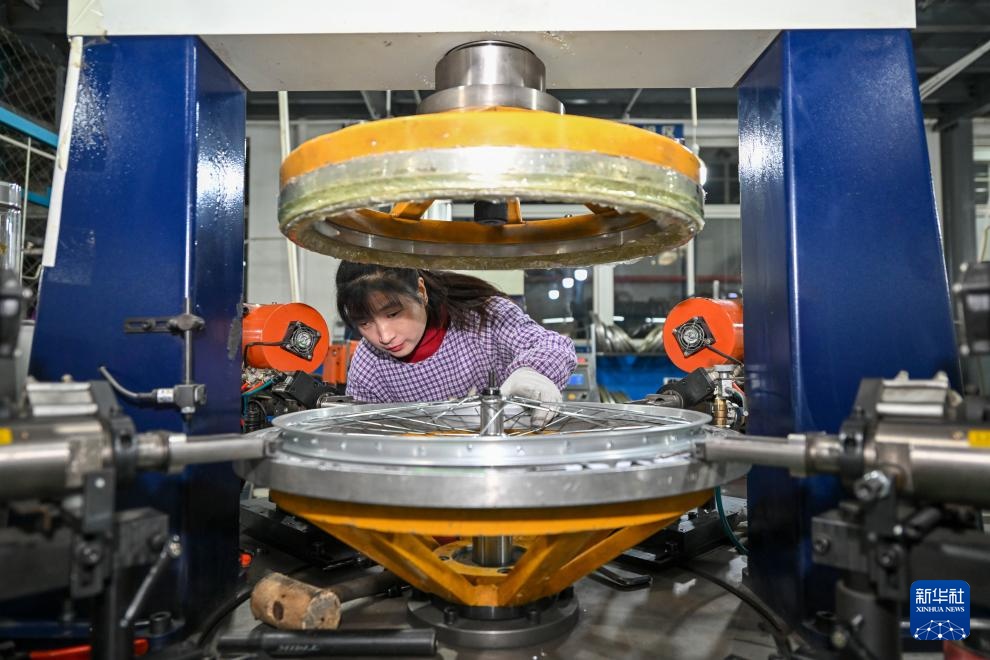 12月6日,在天津市武清区王庆坨镇利雅得公司,工人在车间内操作机器生产自行车零部件。