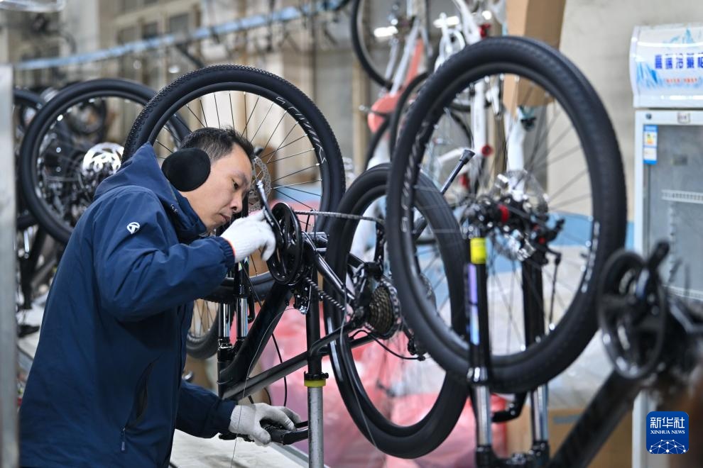12月6日,工人在天津市武清区王庆坨镇利雅得公司生产车间装配自行车。