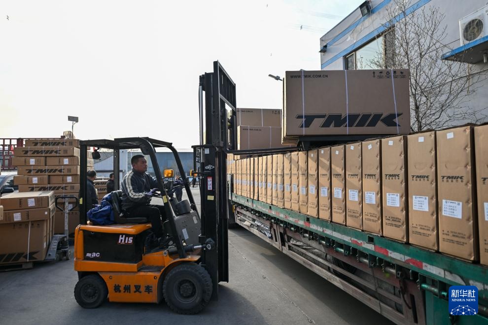 12月6日,在天津市武清区王庆坨镇利雅得公司,工人在装运自行车产品。