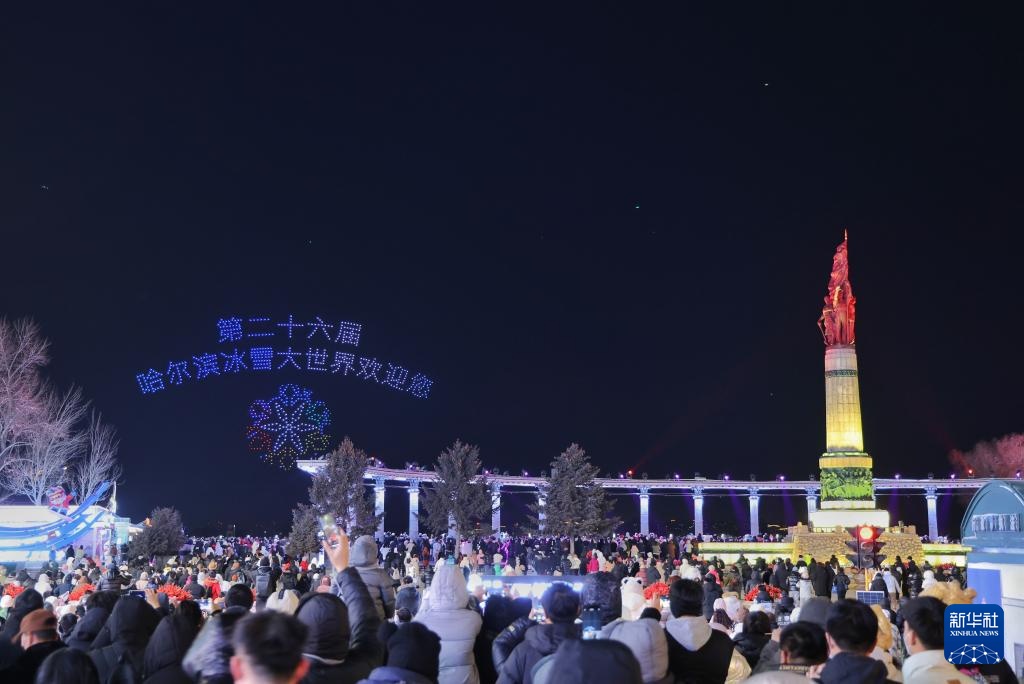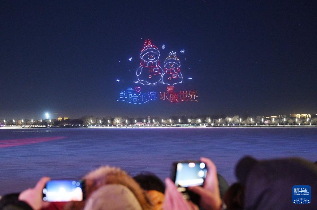 12月6日晚,松花江哈尔滨段上空上演无人机光影秀,为即将到来的第五届哈尔滨采冰节和第二十六届哈尔滨冰雪大世界预热,吸引众多市民和游客前来观看。
