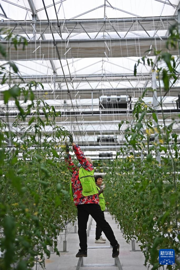 12月6日,在浙江省衢州市衢江区高家未来农业园区大棚内,农民在对番茄植株进行吊蔓作业。