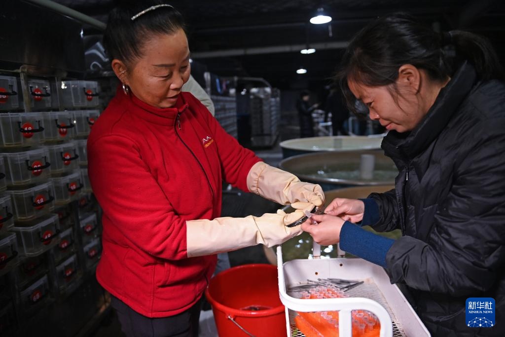 12月6日,在浙江省衢州市鲟龙科技公司的鲟鱼繁育车间内,工人在对鲟鱼鱼苗进行性别鉴定。