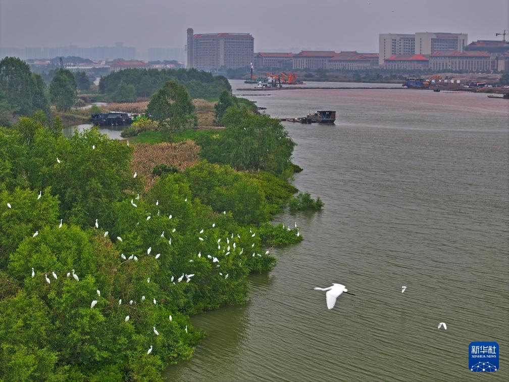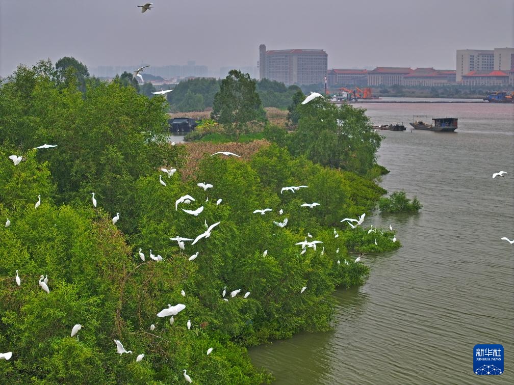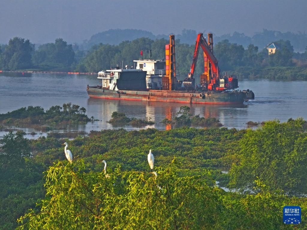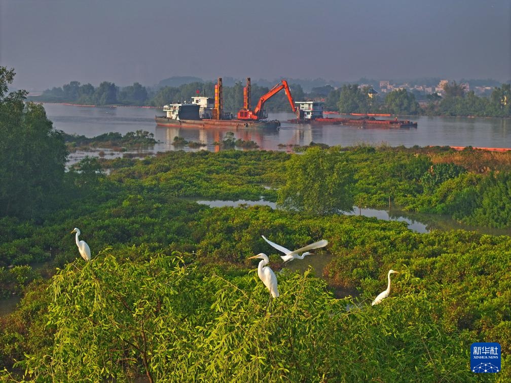 初冬时节,广西钦州平陆运河航道疏浚作业区及岸边,大群白鹭觅食、栖息。白鹭和航道疏浚作业现场形成一幅和谐画面。