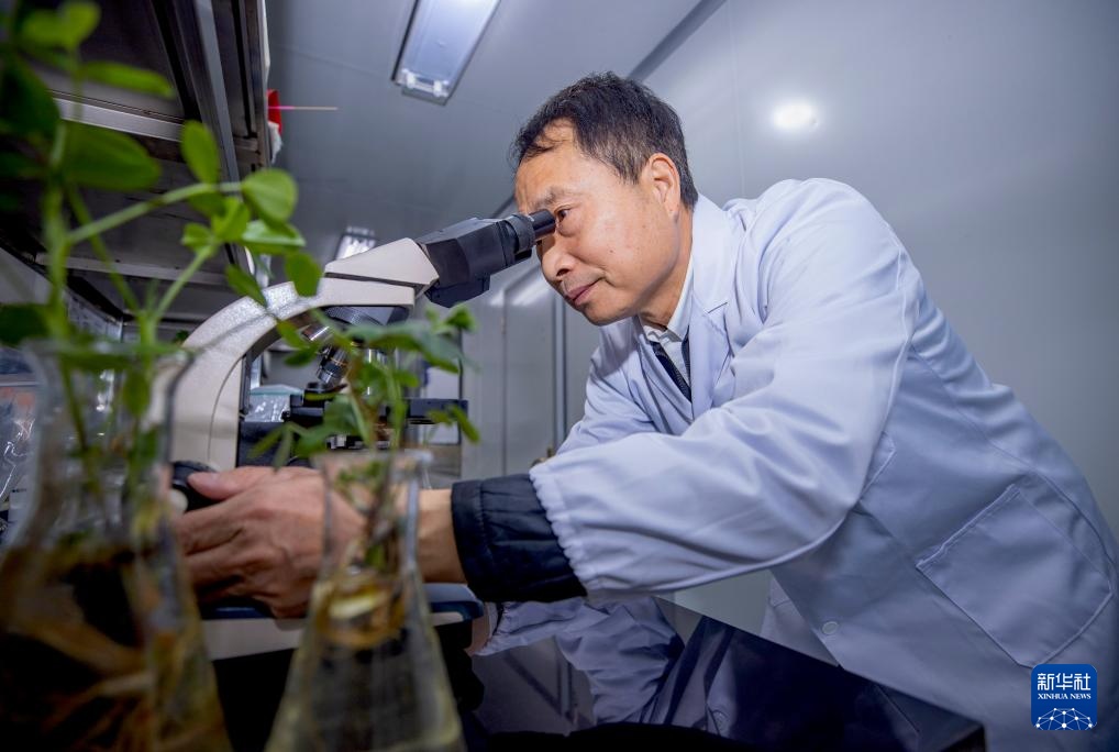12月6日,杨国平在实验室通过显微镜查看抗盐碱微生物的实验情况。