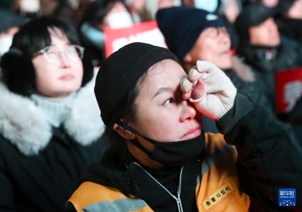 12月7日,在位于韩国首尔的国会附近,民众观看总统尹锡悦弹劾案表决结果。