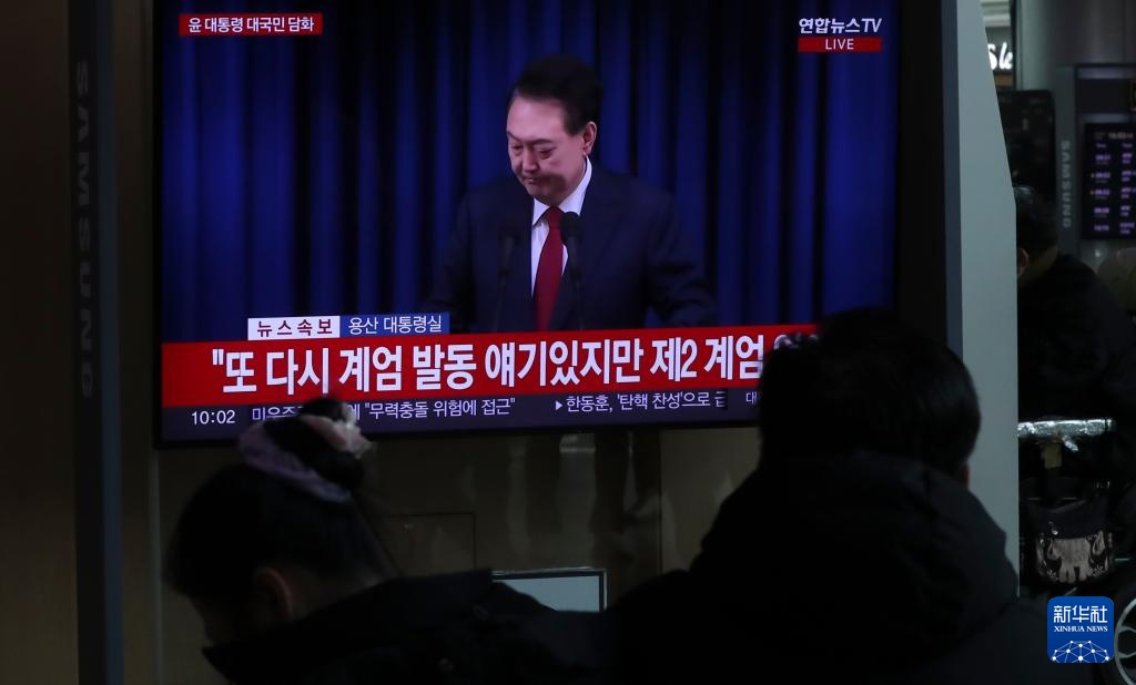 12月7日,在韩国首尔火车站,民众观看总统尹锡悦就紧急戒严风波向国民道歉的电视画面。