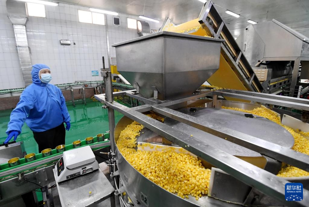 12月8日,在河北省晋州市一家罐头食品加工企业,工人在玉米罐头生产线上工作。