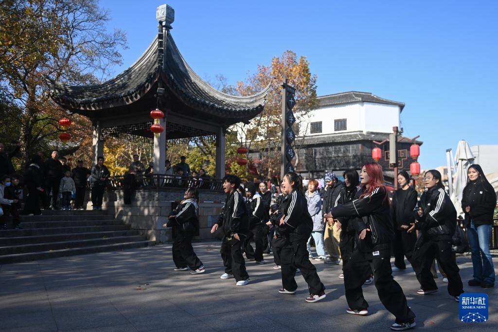 12月8日,大学生在南浔古镇表演街舞。