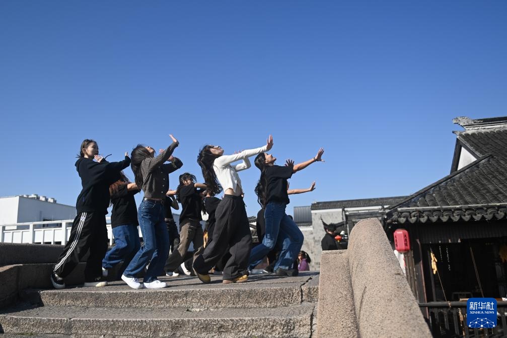 当日,在浙江省湖州市南浔区参加2024年中国大学生街舞锦标赛的学生代表受邀来到南浔古镇。学生们以古镇为舞台,即兴表演多场激情四溢的街头舞蹈,为游客带来独特的体验。