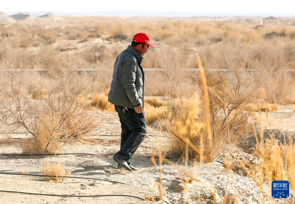 麦麦提在承包的沙地里检查滴灌带铺设情况(12月4日摄)。