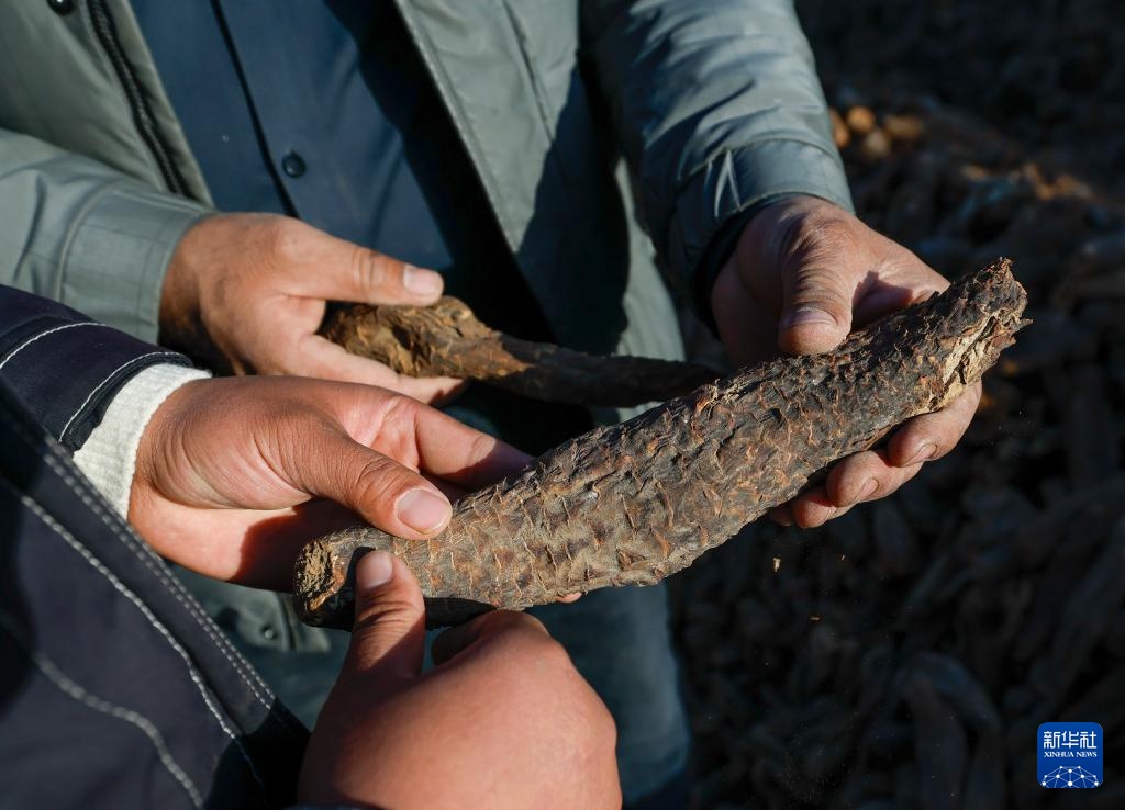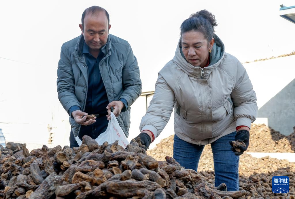 麦麦提和妻子挑选晾干的大芸准备出售(12月4日摄)。