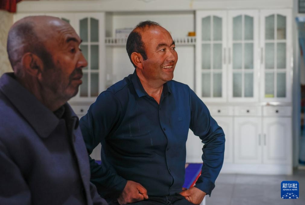 麦麦提(右)在家中与家人聊天(12月4日摄)。