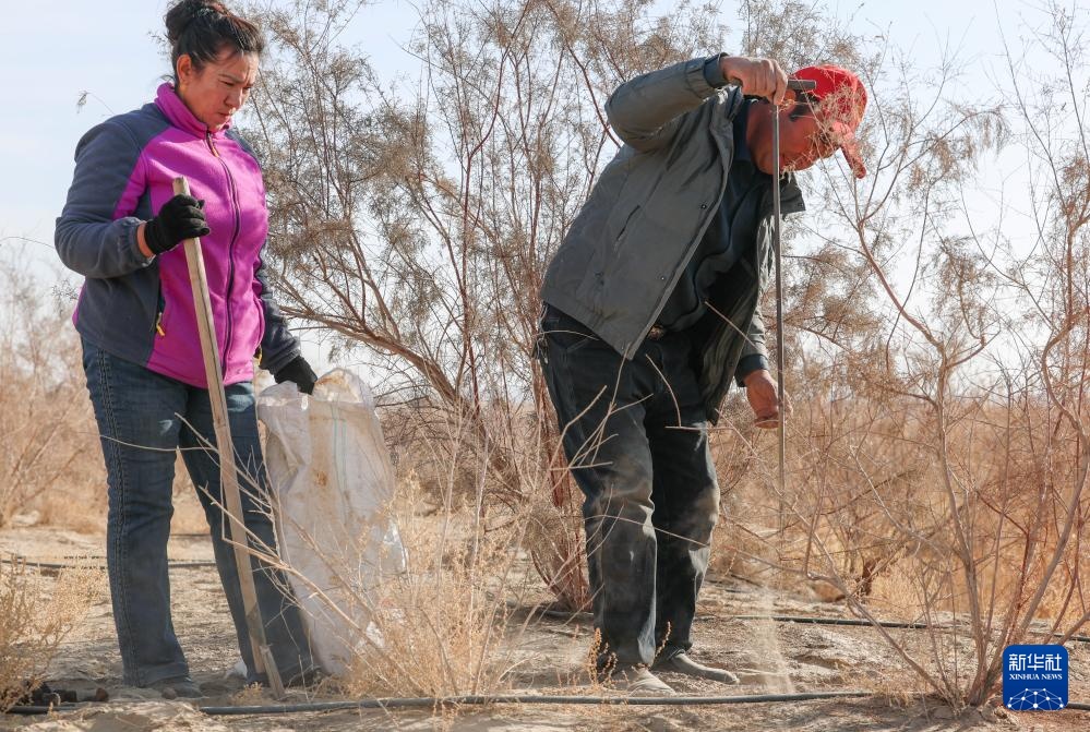 麦麦提和妻子在承包的沙地里检查滴灌带铺设情况(12月4日摄)。