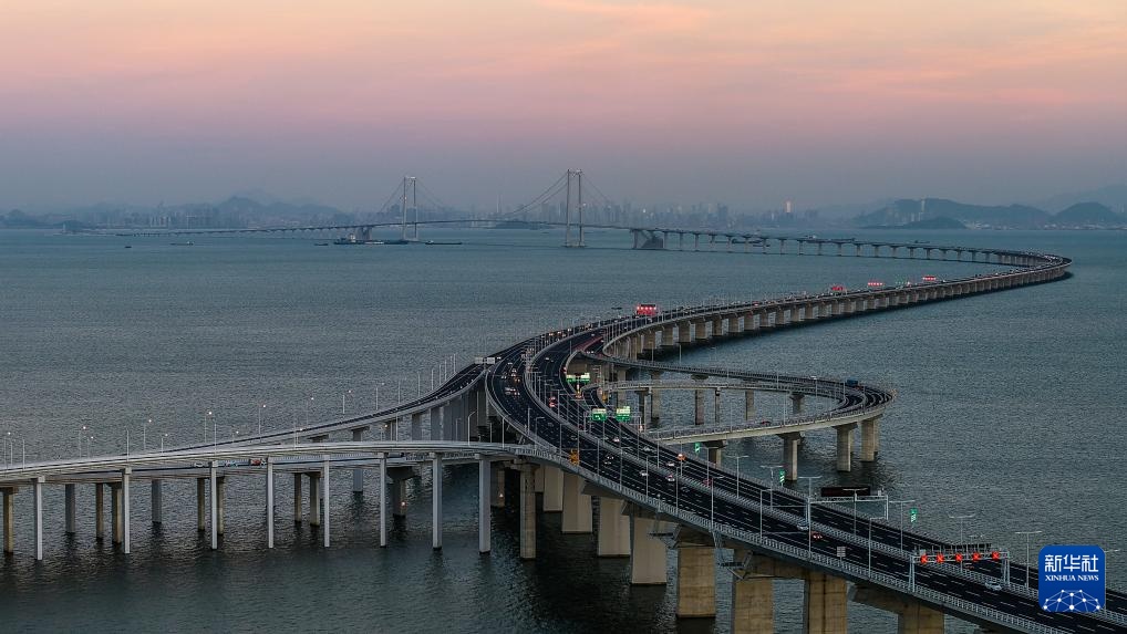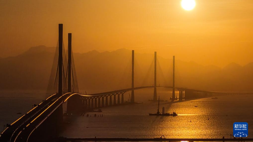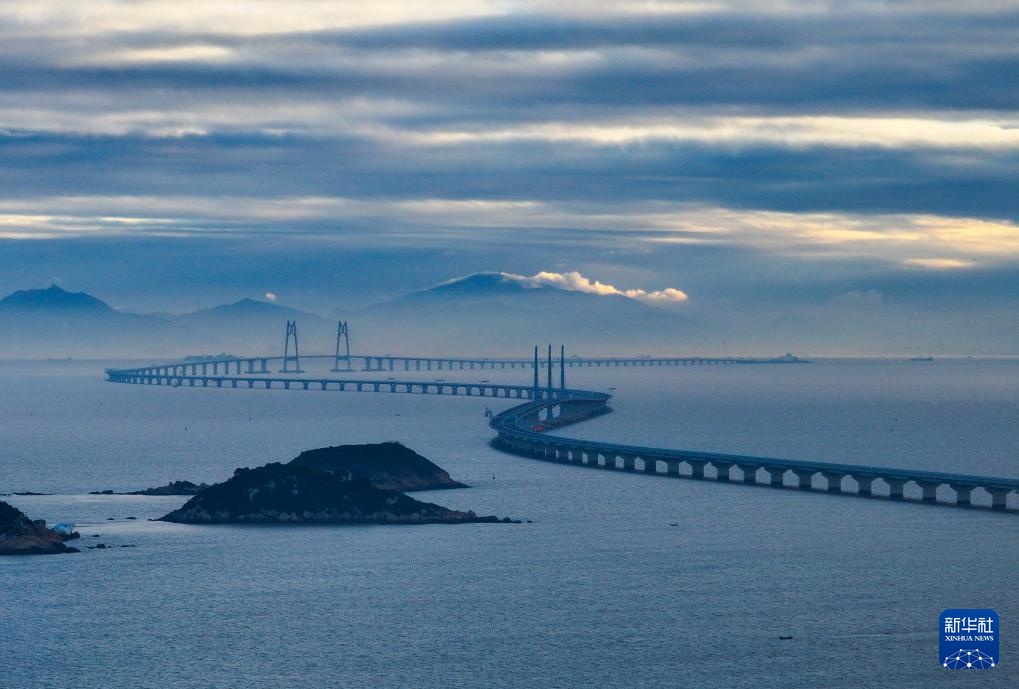 晨曦中的港珠澳大桥(2023年12月15日摄,无人机照片)。港珠澳大桥横跨珠江口伶仃洋海域,全长约55公里,集桥、岛、隧于一体,是世界最长的跨海大桥。