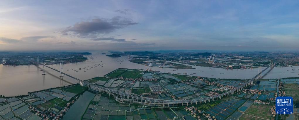 南沙大桥全景(2022年6月29日摄,无人机照片)。南沙大桥跨珠江口狮子洋水域,连接广州市南沙区东涌镇、番禺区海鸥岛和东莞市沙田镇。