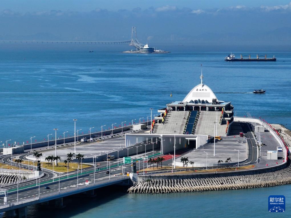 港珠澳大桥东人工岛和西人工岛遥相呼应(2023年12月15日摄,无人机照片)。港珠澳大桥横跨珠江口伶仃洋海域,全长约55公里,集桥、岛、隧于一体,是世界最长的跨海大桥。