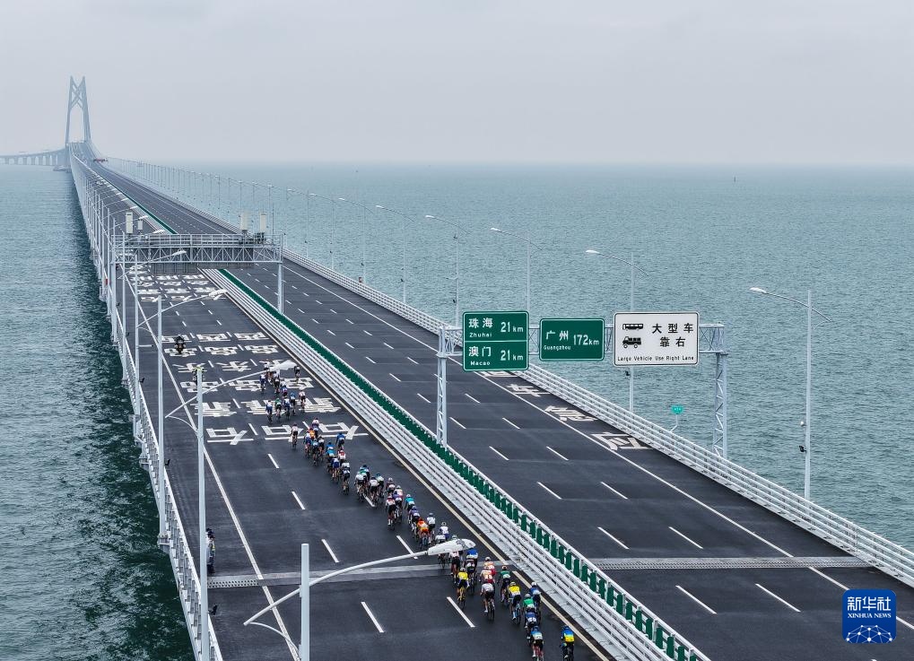 2024年11月24日,2024粤港澳公路自行车赛暨第十五届全国运动会公路自行车测试赛举行,比赛跨越粤港澳三地,参赛选手途经港珠澳大桥(无人机照片)。