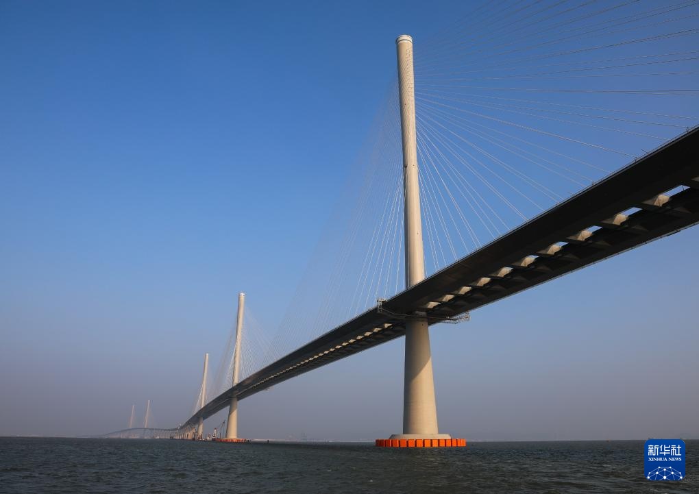 黄茅海大桥(右侧三主塔)和高栏港大桥(左侧双主塔)(2024年12月7日摄)。黄茅海跨海通道始于珠海高栏港,终于江门台山斗山镇,横跨珠江口崖门入海口黄茅海水域,线路全长约31公里,其中跨海段主要由高栏港大桥和黄茅海大桥组成。