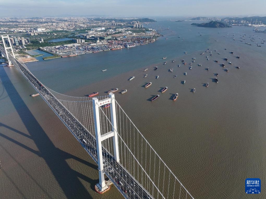 南沙大桥上的车流和狮子洋水道的船舶来来往往(2024年10月2日摄,无人机照片)。南沙大桥跨珠江口狮子洋水域,连接广州市南沙区东涌镇、番禺区海鸥岛和东莞市沙田镇。