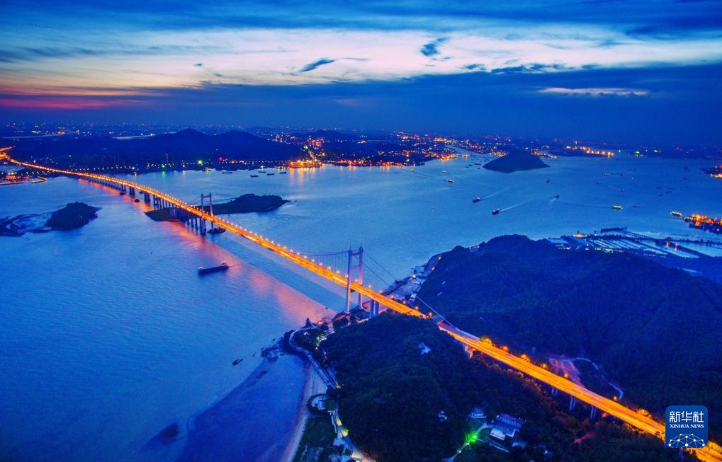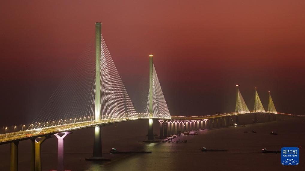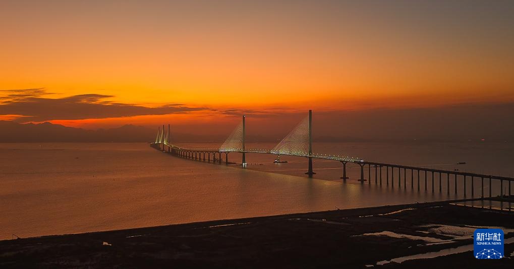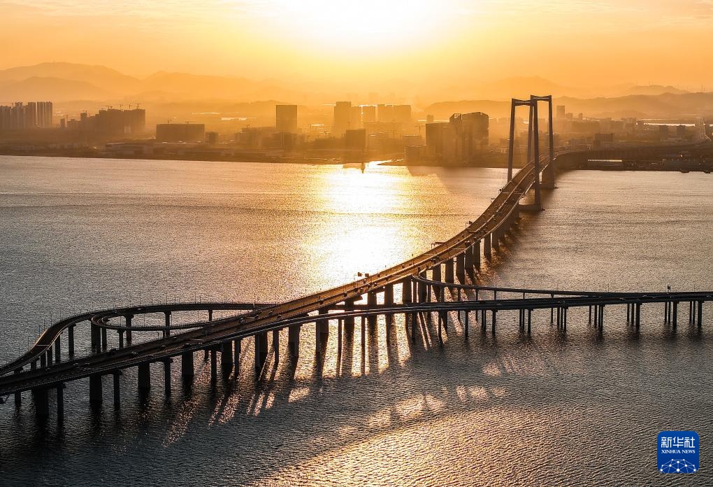 夕阳余晖中的高栏港大桥(左侧双主塔)和黄茅海大桥(右侧三主塔)(2024年12月7日摄,无人机照片)。黄茅海跨海通道始于珠海高栏港,终于江门台山斗山镇,横跨珠江口崖门入海口黄茅海水域,线路全长约31公里,其中跨海段主要由高栏港大桥和黄茅海大桥组成。