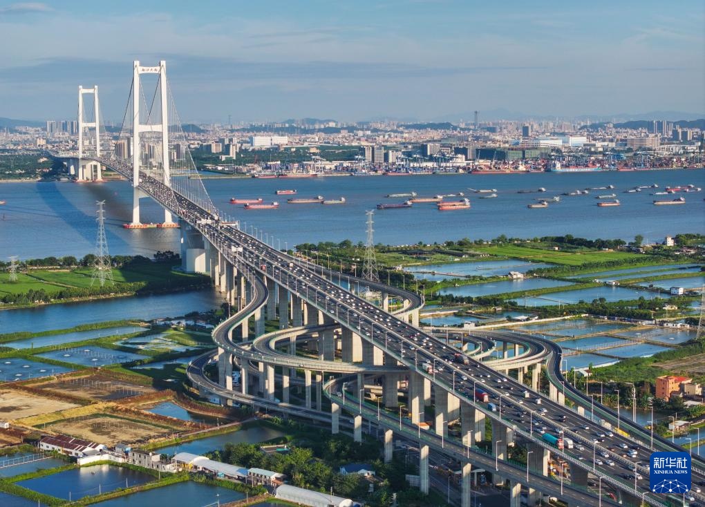 南沙大桥海鸥岛互通立交上车流穿梭(2024年10月2日摄,无人机照片)。南沙大桥跨珠江口狮子洋水域,连接广州市南沙区东涌镇、番禺区海鸥岛和东莞市沙田镇。