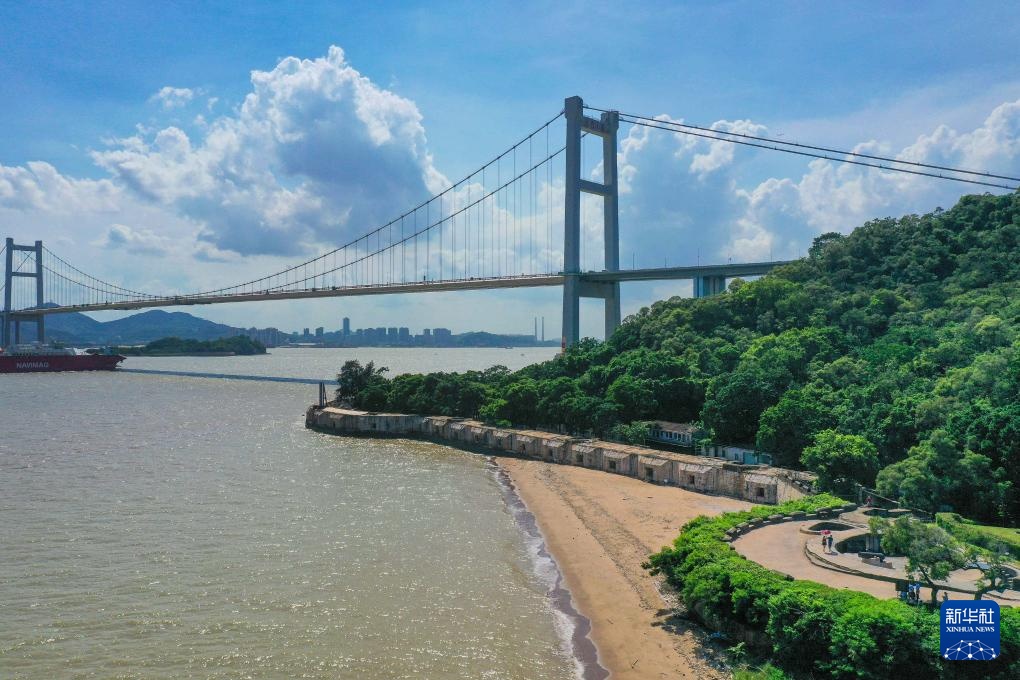 虎门大桥紧邻鸦片战争战场遗址之一的威远炮台(2020年6月23日摄,无人机照片)。虎门大桥横跨珠江口狮子洋水道,连接广州市南沙区与东莞市虎门镇。