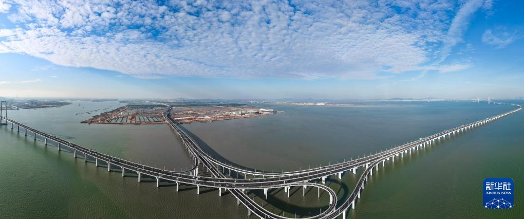广州南沙区通过万顷沙支线连接深中通道,与深圳、中山在伶仃洋上“牵手”(2024年11月27日摄,无人机照片)。该支线通车后,南沙前往深圳的车程可缩短至20分钟以内,前往中山城区的车程可缩短到15分钟以内。