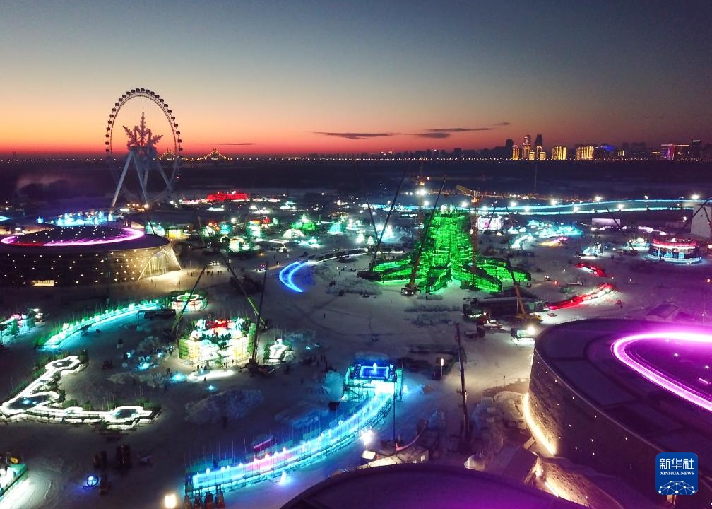 这是12月9日拍摄的哈尔滨冰雪大世界雪花摩天轮附近的施工场景(无人机照片)。