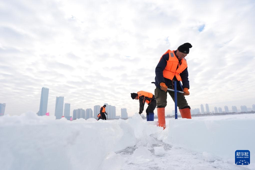 12月9日,工人在哈尔滨冰雪大世界采冰现场作业。
