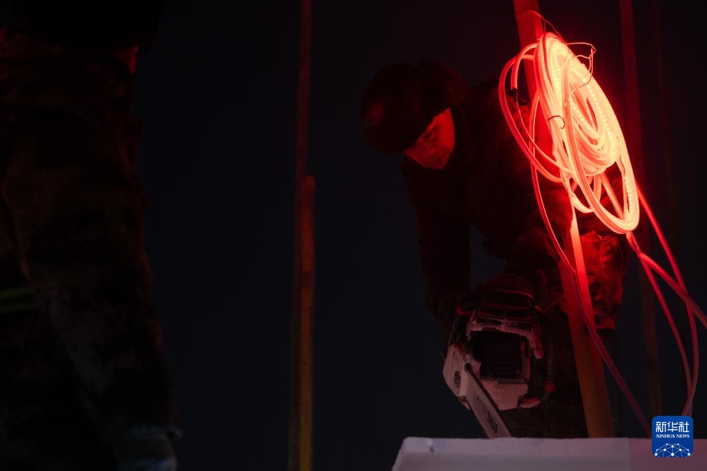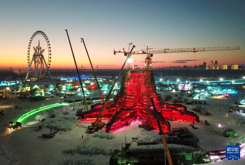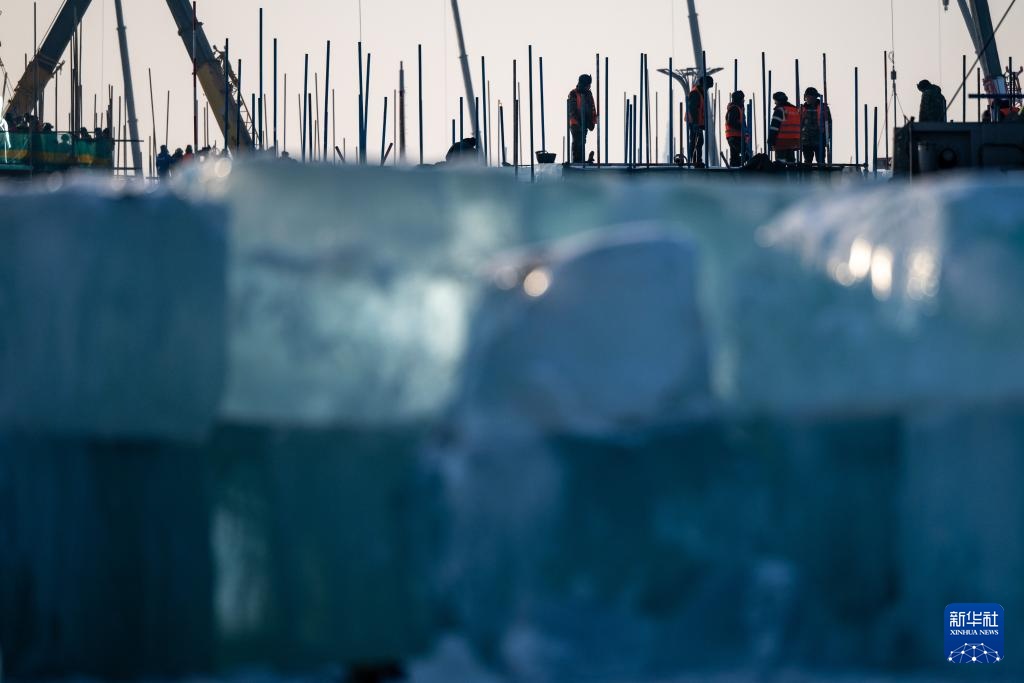 12月9日,工人在哈尔滨冰雪大世界冰建施工现场作业。